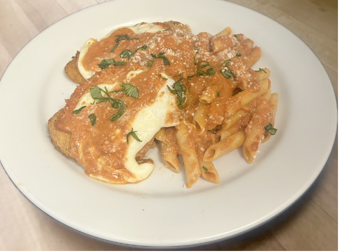 Breaded & topped with our homemade vodka sauce, fresh mozzarella & fresh basil. Served with Penne pasta. Includes garlic knots.