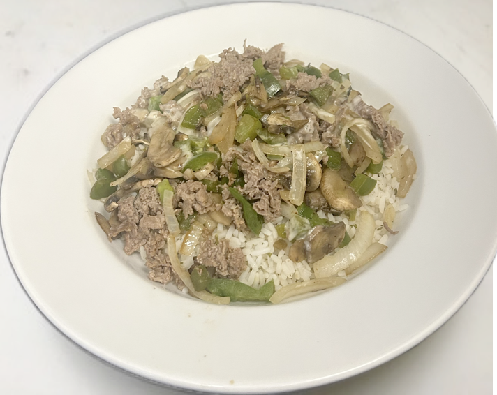 Choice of Bowl or Burrito with Steak, fried onions, green peppers, mushrooms and American cheese. Server over cilantro lime rice