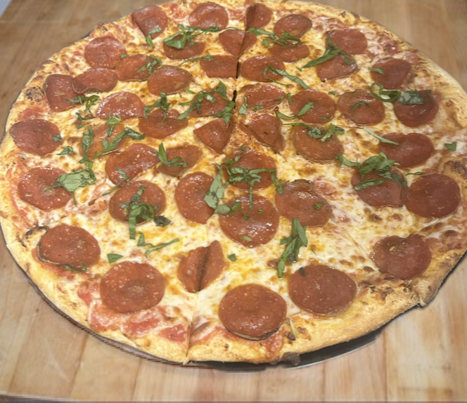 Pepperoni, Sauce, mozzarella cheese & fresh basil drizzled with hot honey.