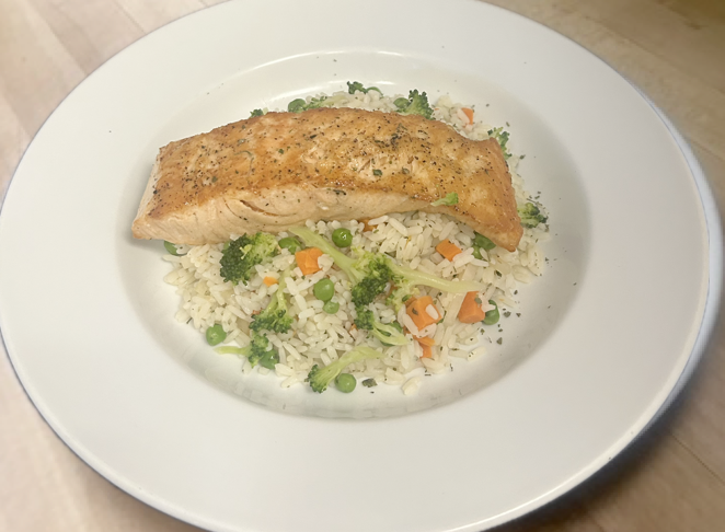 Baked salmon served over a cilantro lime rice with green peas, carrots, onions and broccoli. Includes garlic knots.