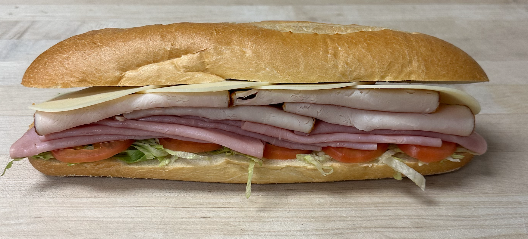 A blend of lettuce, tomatoes, red onions & cucumbers topped with turkey, provolone cheese and imported ham. (Serves 6-8)