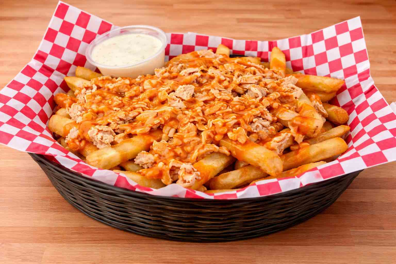 Smothered with cheddar sauce, mozzarella cheese & bacon. Served with a side of ranch. (Serves 6-8)