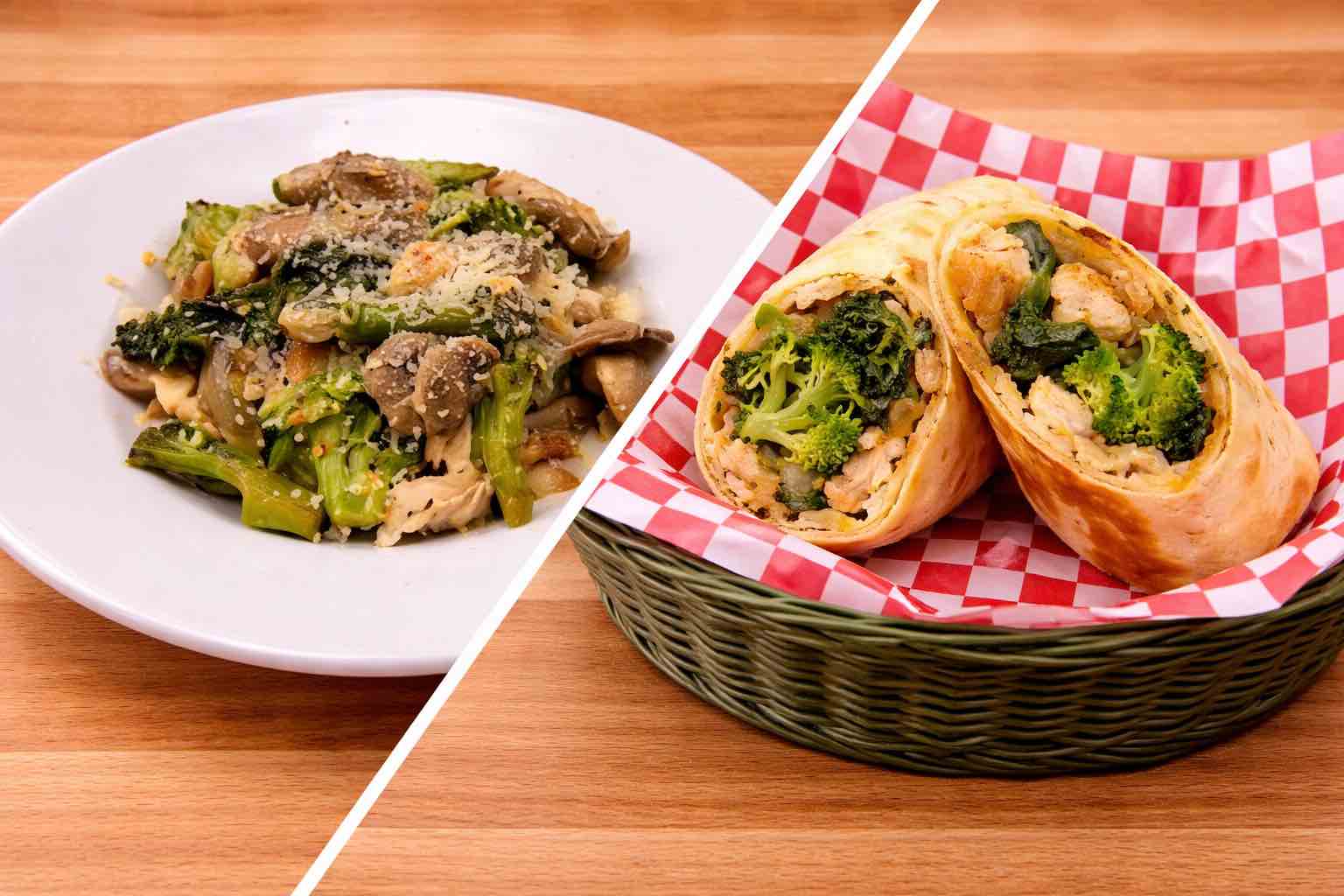 Choice of Bowl or Burrito with Grilled chicken strips, broccoli, spinach, sautéed mushrooms with garlic & imported parmesan cheese served with cilantro lime rice.
