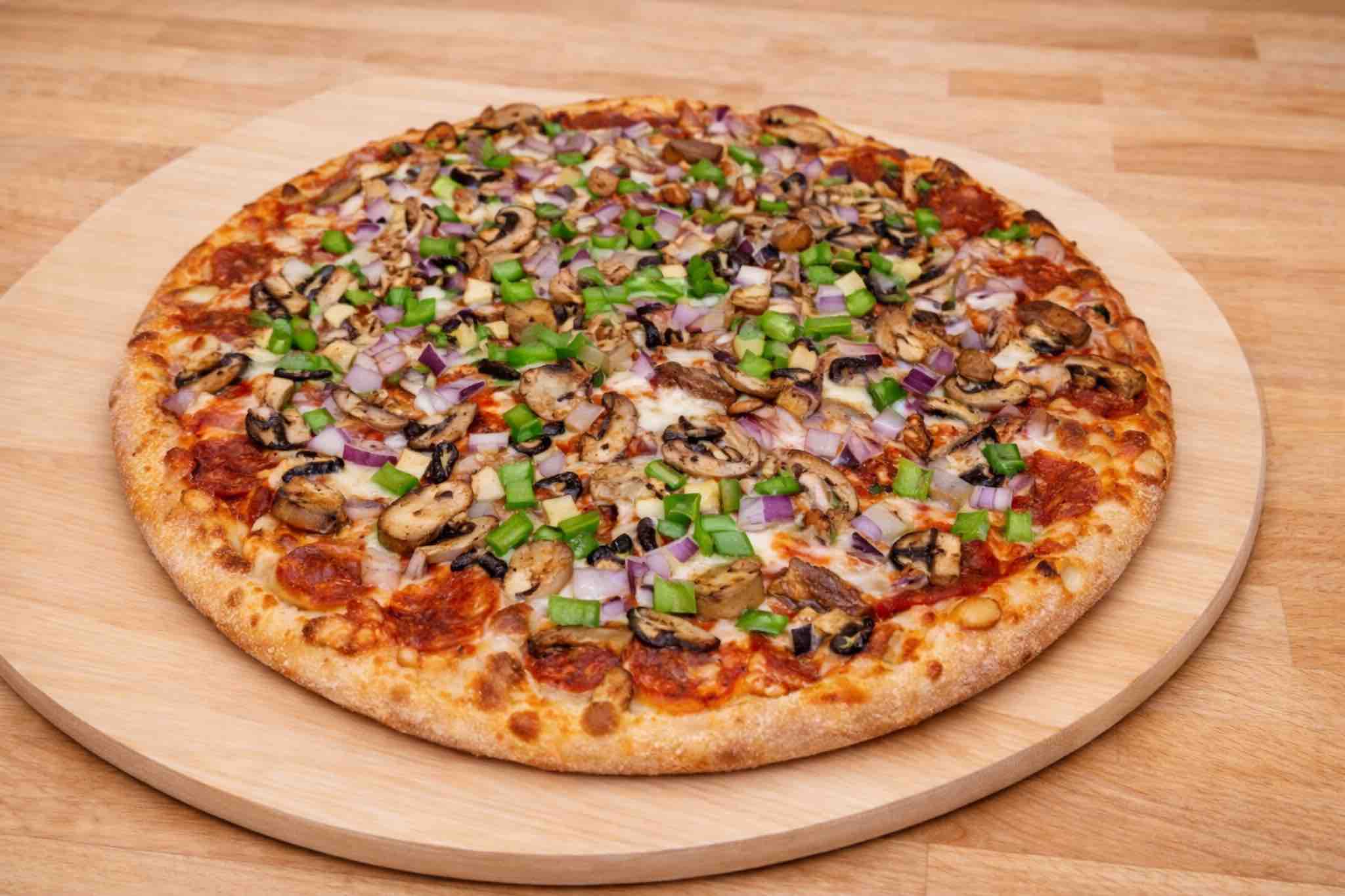 Pepperoni, sausage, mushrooms, red onions, green peppers, sauce, & mozzarella cheese