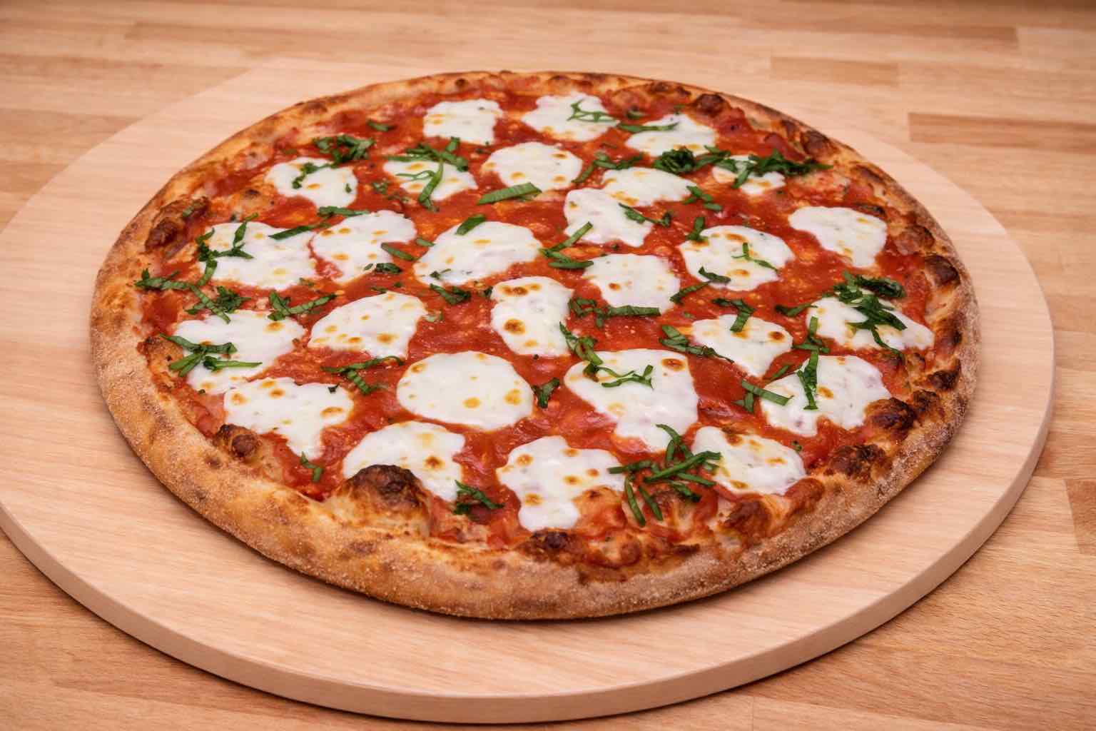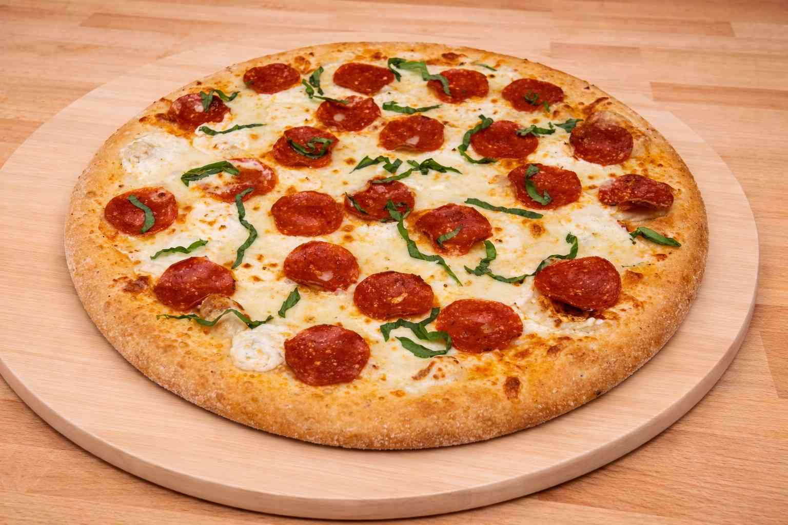 A combination of high quality cheese, ricotta, fresh mozzarella, parmesan, shredded mozzarella and pepperoni on an olive oil and oregano pizza crust topped with fresh basil