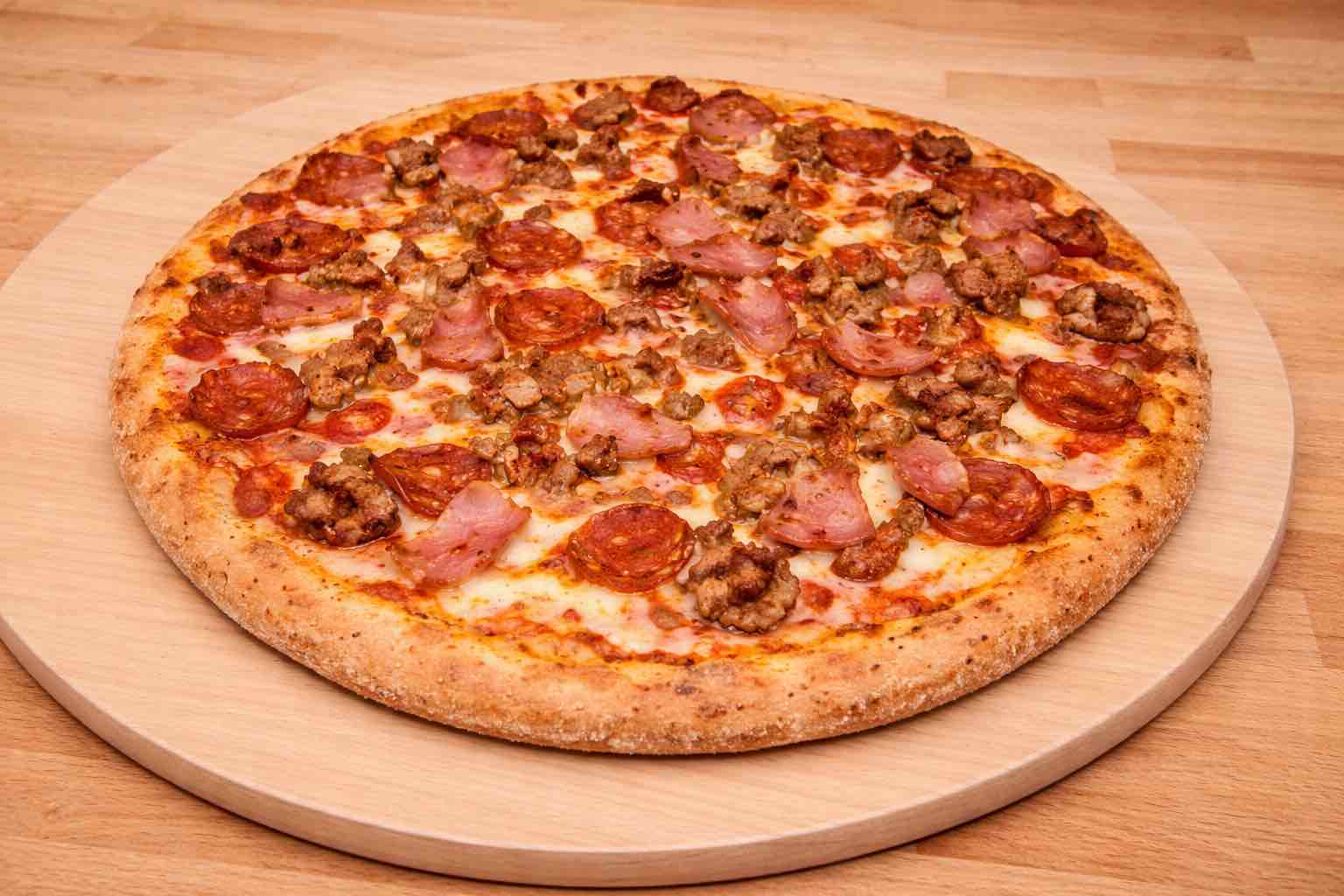Pepperoni, sausage, bacon, ham, sauce, & mozzarella