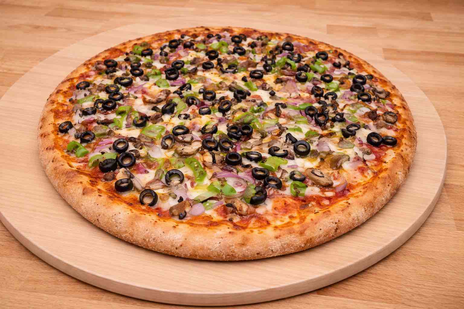 Green peppers, red onions, mushrooms, black olives, sauce, & mozzarella
